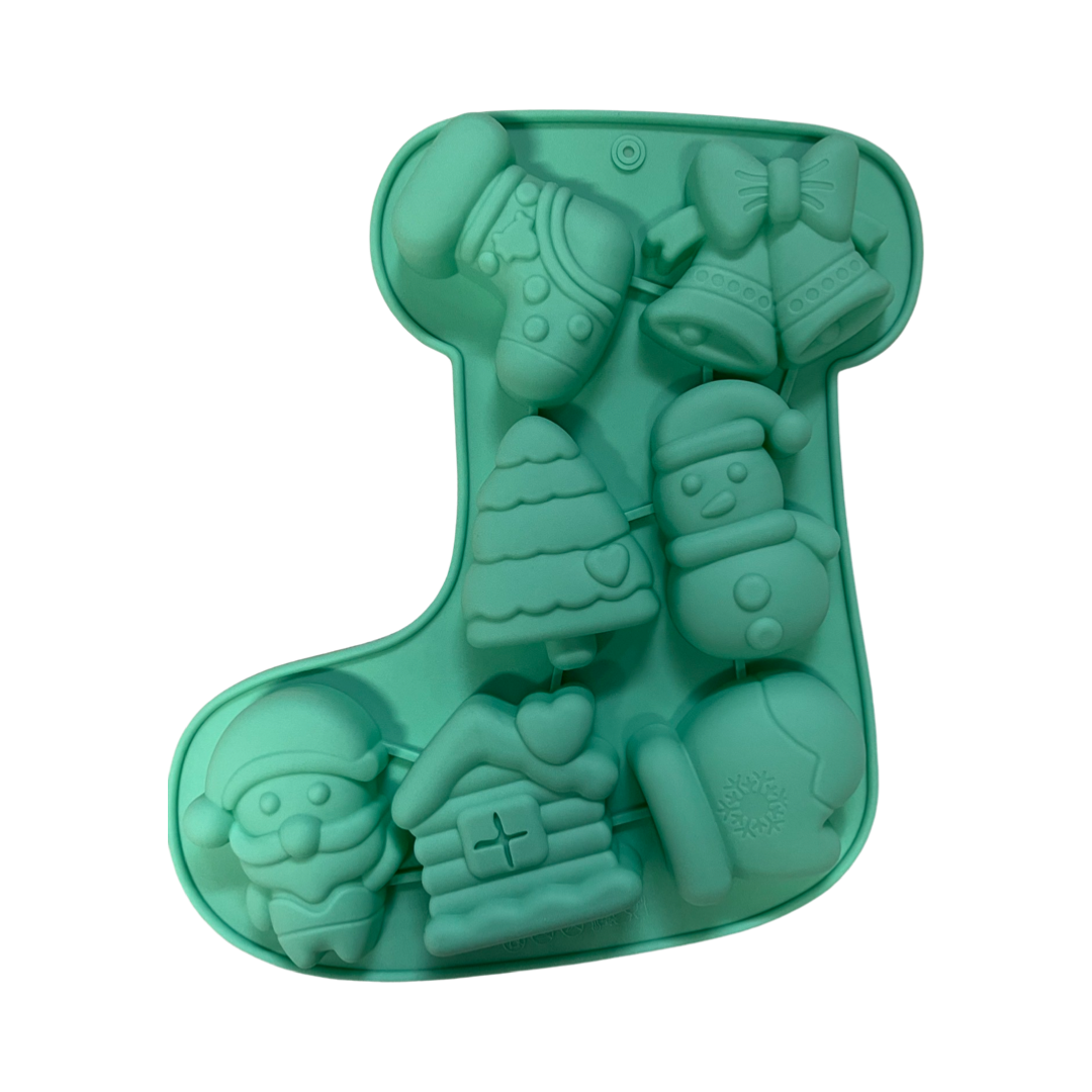 Molde de tema naideño. Siete moldes de Santa, Snowman, y árbol de Navidad hechos en silicone con forma de bota.